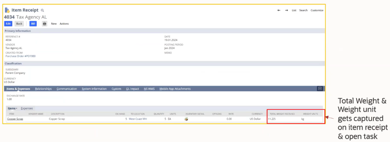 When you receive items for purchase orders on the WMS Mobile app, you can capture the weight of an item directly from your weighing scale. Through the PrintNode integration, you can connect weighing scales to your local computers.