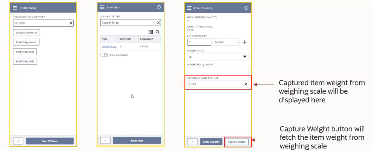 On the app, you can choose the weighing scale you want to use in your location. The Enter Quantity page displays the Capture Weight option for obtaining the item weight per quantity.
